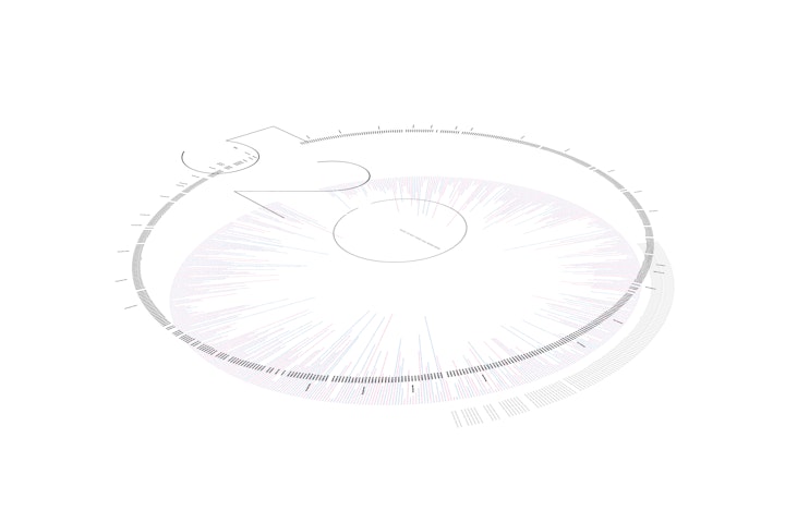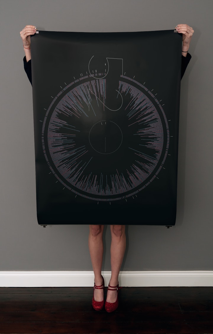 SMS dialogue of the few text messages that went into arranging a first date, then the first month of a relationship afterward. Arranged over 520 lines, the format is based on a radial convergence diagram with the calendar date arranged around the outside in white, then the timestamp of each message creates an inner-ring, with the text messages themselves reading inwards from the outside, all reading anti-clockwise. The centre (zero) ring is a series of dashed lines, one for every line of dialogue, hence why it looks darker than the five and two.