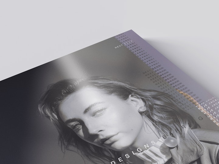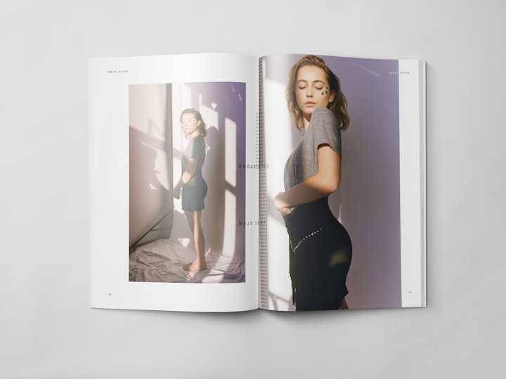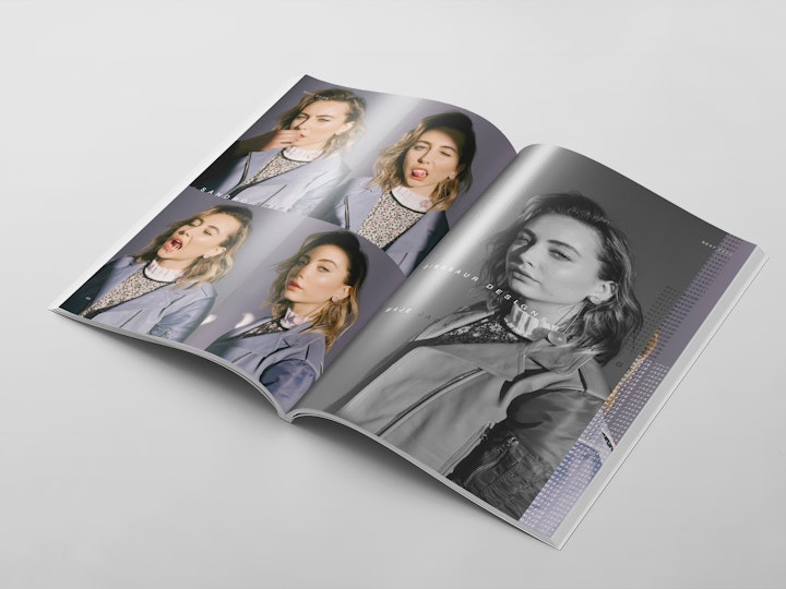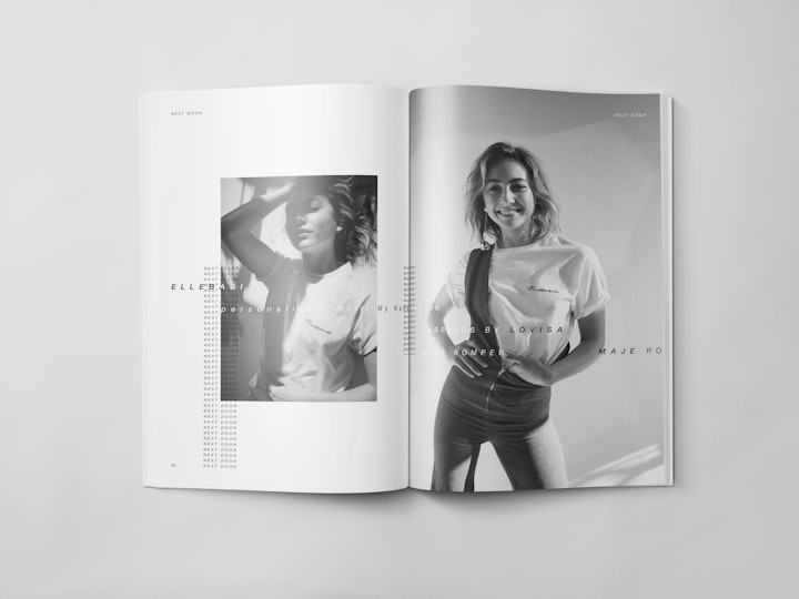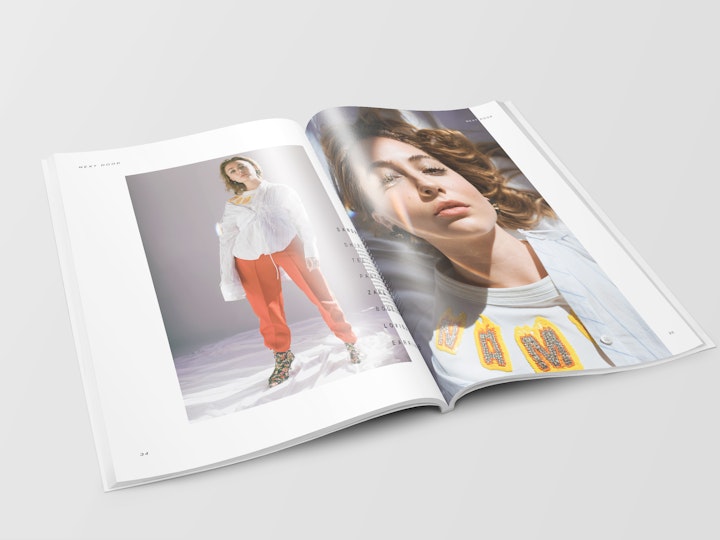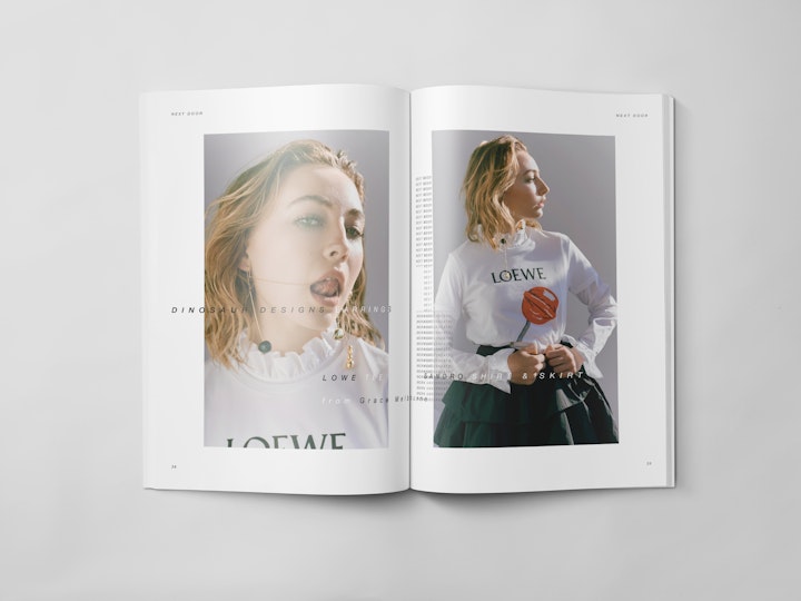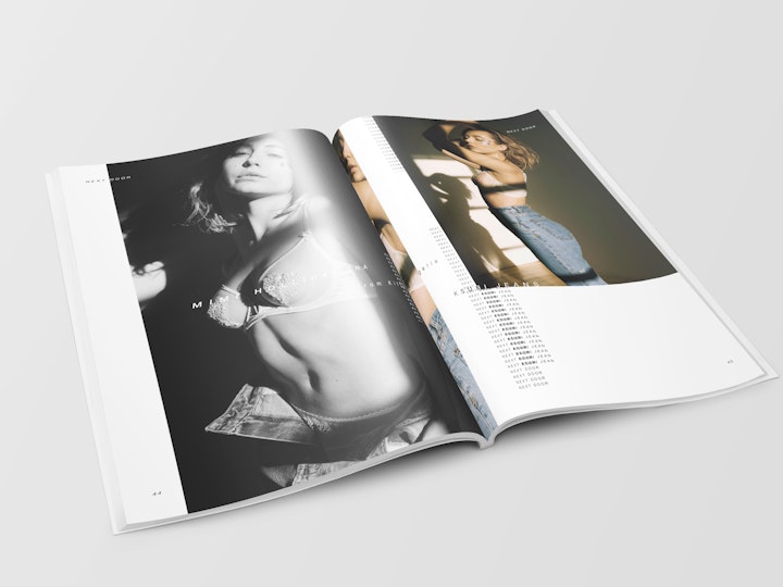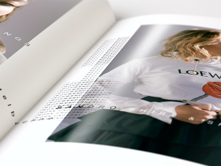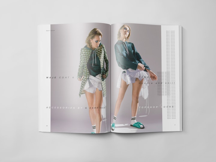 Strict 6x6x9 SPS grid with oversized wardrobe credits across each spread. The continually repeated and offset placement of typographic patterns (both within, and across spreads) gives emphasis to the often downplayed clothing credits; both disrupting the traditional fashion photo story treatment, and providing a structure with which to validate the photograph subject beneath.