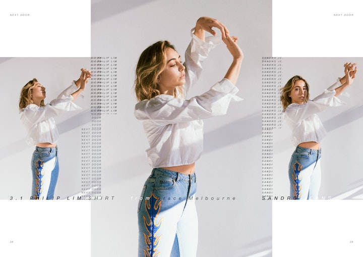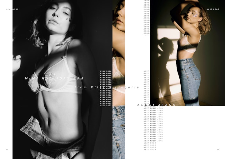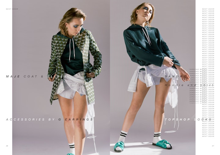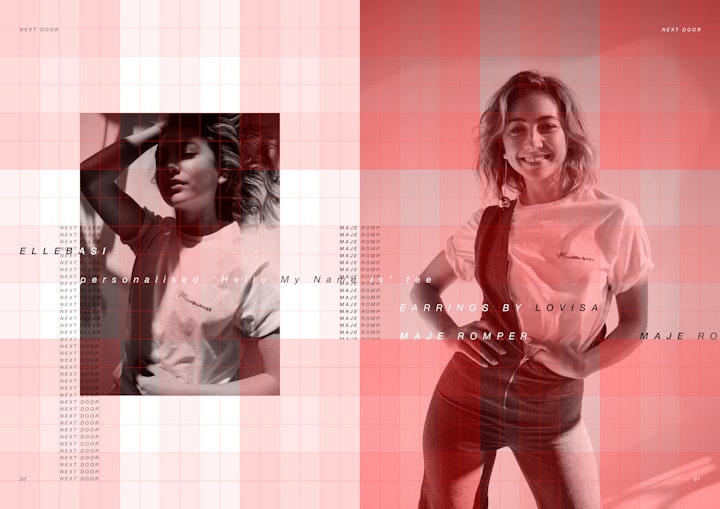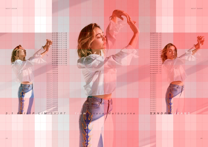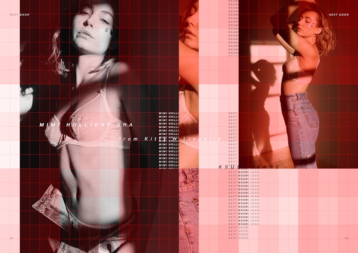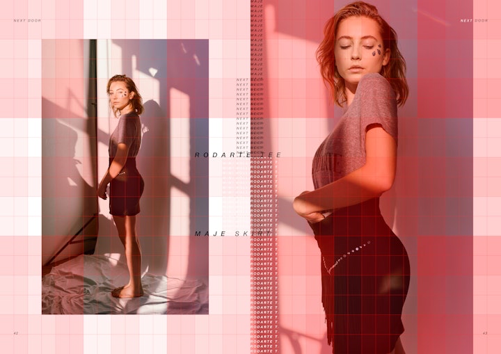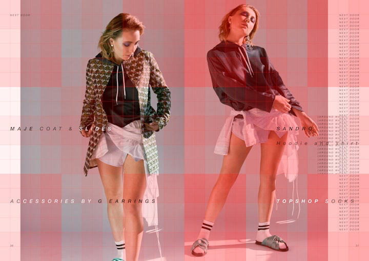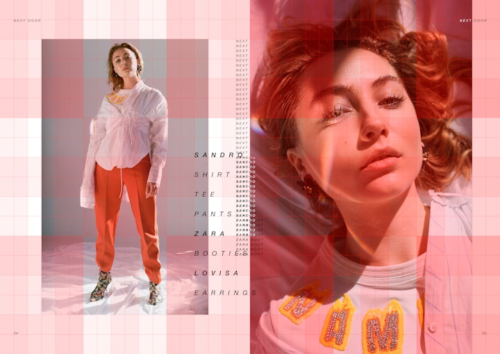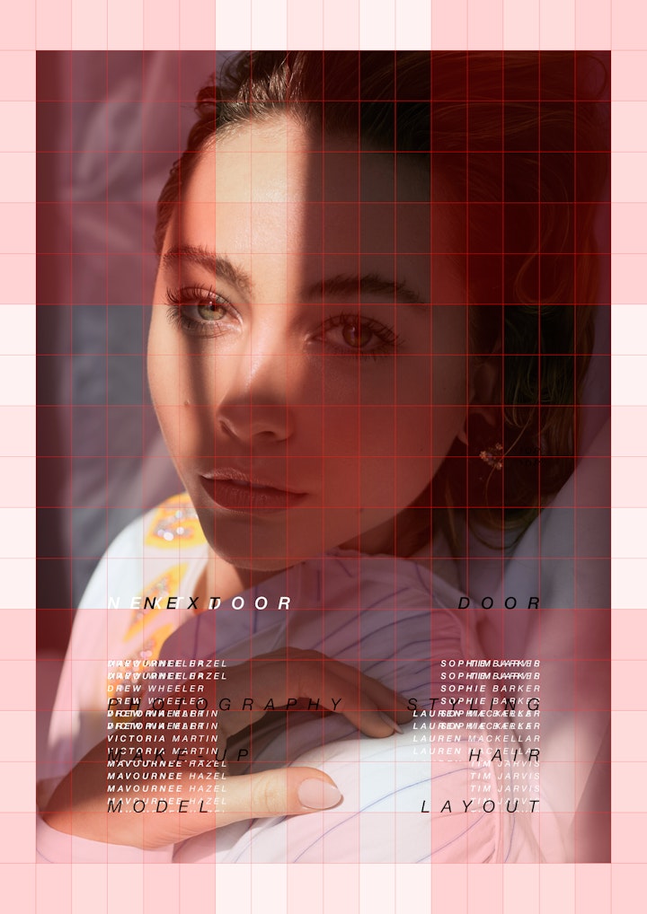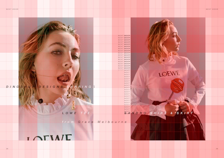 Strict 6x6x9 SPS grid with oversized wardrobe credits across each spread. The continually repeated and offset placement of typographic patterns (both within, and across spreads) gives emphasis to the often downplayed clothing credits; both disrupting the traditional fashion photo story treatment, and providing a structure with which to validate the photograph subject beneath.