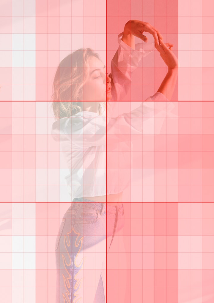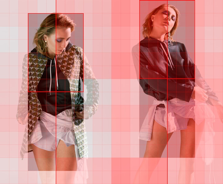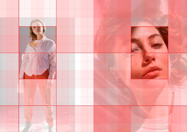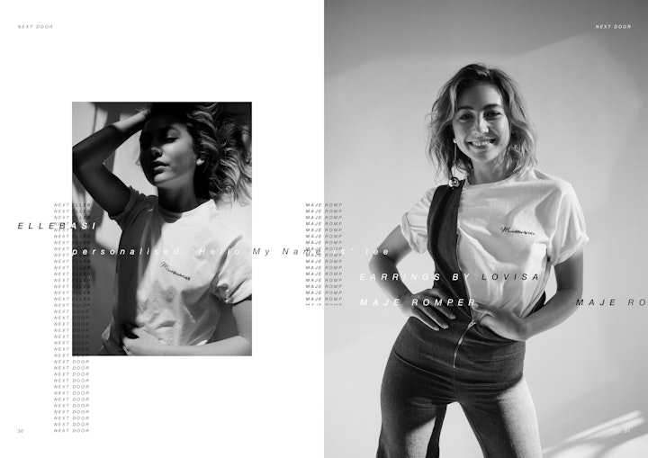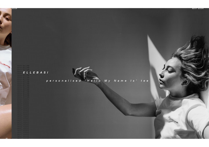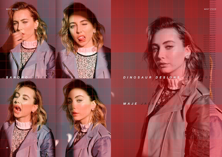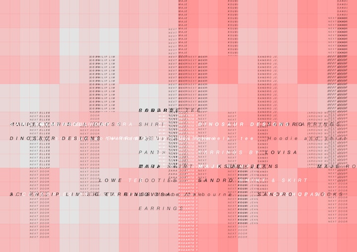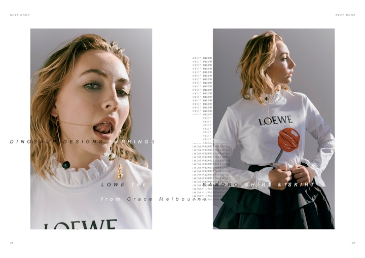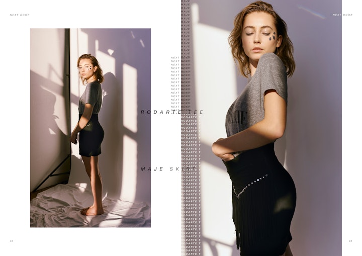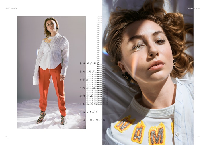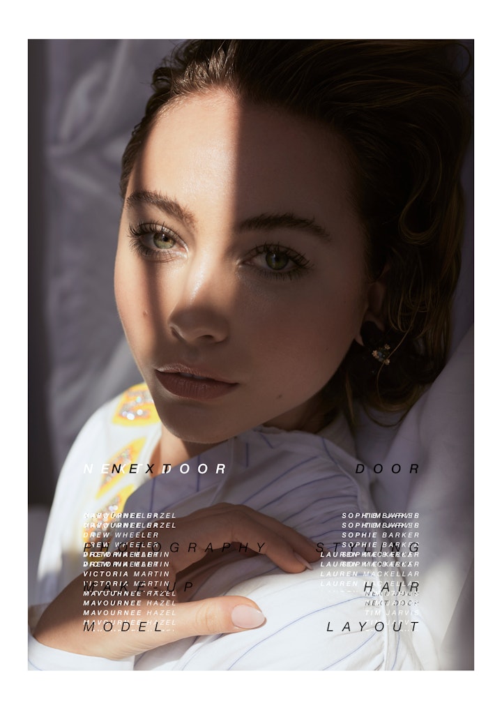 Strict 6x6x9 SPS grid with oversized wardrobe credits across each spread. The continually repeated and offset placement of typographic patterns (both within, and across spreads) gives emphasis to the often downplayed clothing credits; both disrupting the traditional fashion photo story treatment, and providing a structure with which to validate the photograph subject beneath.